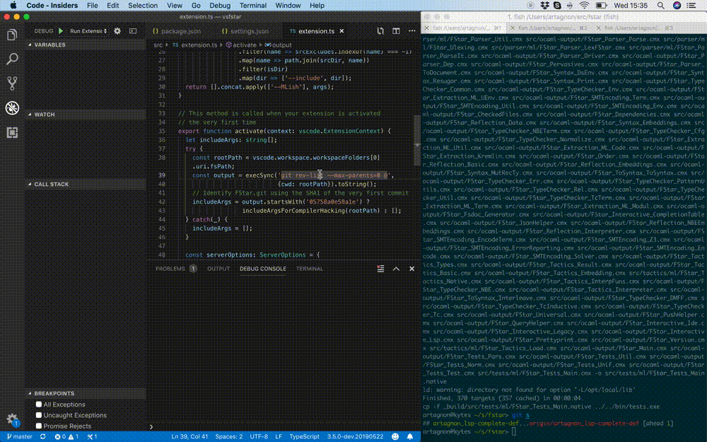 A Visual Studio Code extension for F*, with support for hacking on the F* compiler baked in. Uses the Language Server Protocol to provide the following features: