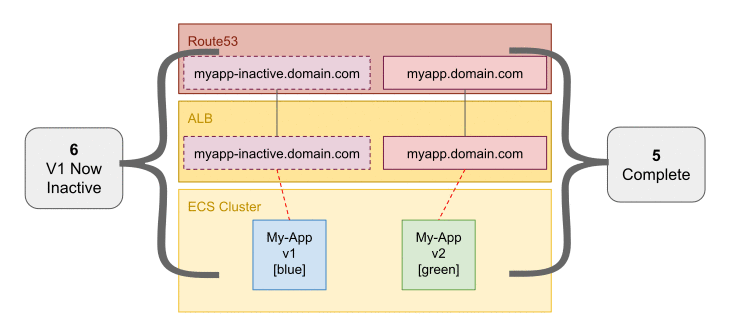 I've scrapped the idea of the DNS swap and stopped doing that so for right now; the deployment tasks just deploy to a pre-production env which 100% matches, except the deployed instance. If it's all good; I prompt for manual update and off it goes into production.