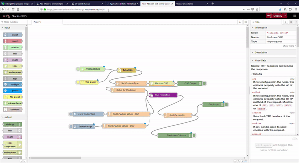 - Use either the microphone node or the file inject node to initiate the flow. Unless you have a cat or dog around, it’s probably better to use the file inject node.