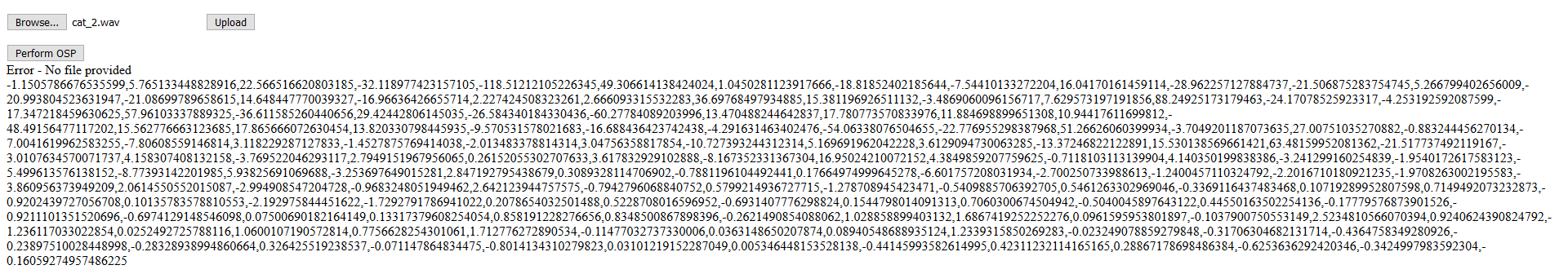 UploadorPerform OSPto select an audio file from the sounds directory in your project on your local machine.- If you see a series of numbers, your application is running, and the API is ready to use in your Node-RED flow.