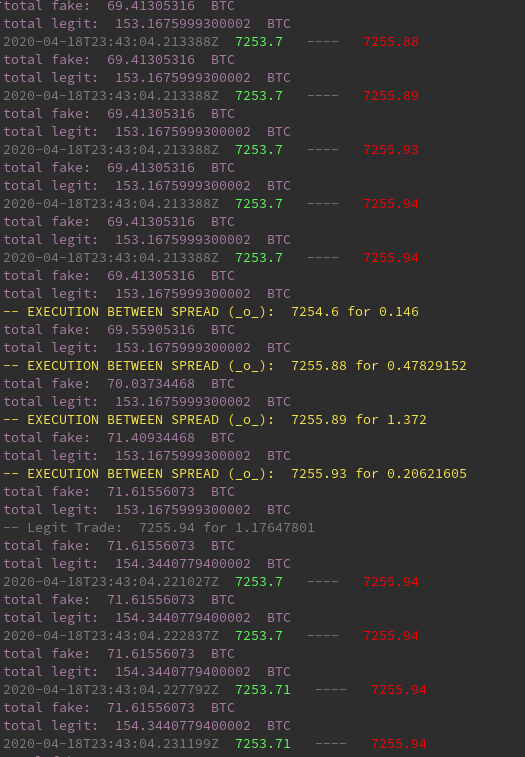 The idea is simple, stream the most real time feeds of the order book best bid/offer and the trades and look for trades which happen inbetween the best bid/offer. These are flagged as 'fake volume' trades since they effectively took from the book a trade which was never on the book, thus executed between the spread.