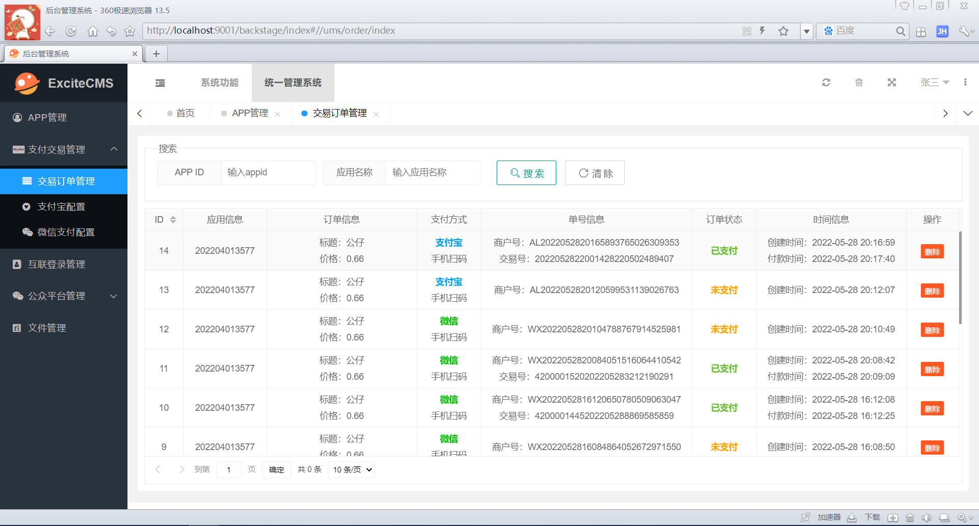 - 订单管理:统一管理微信支付和支付宝支付的订单;