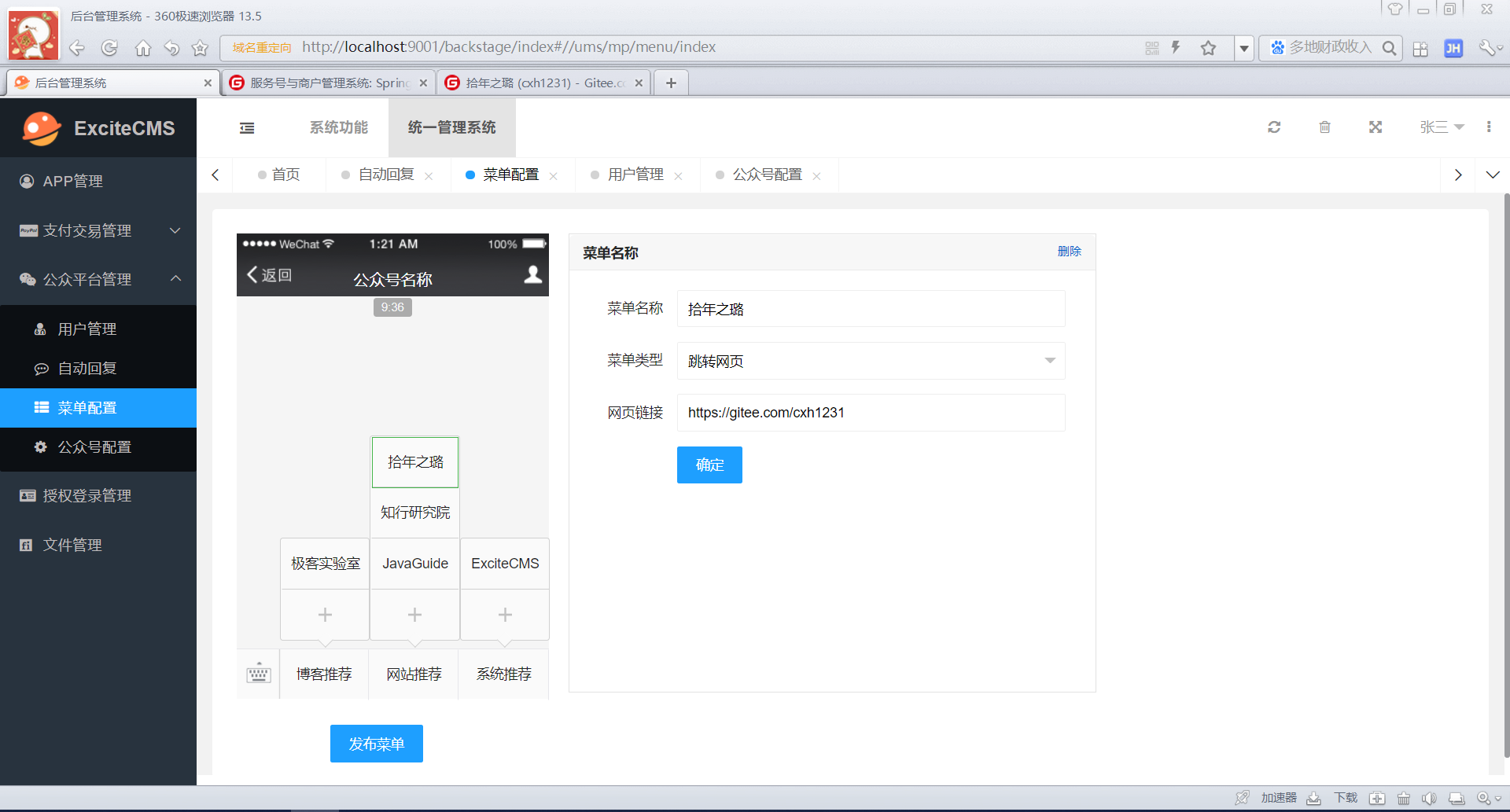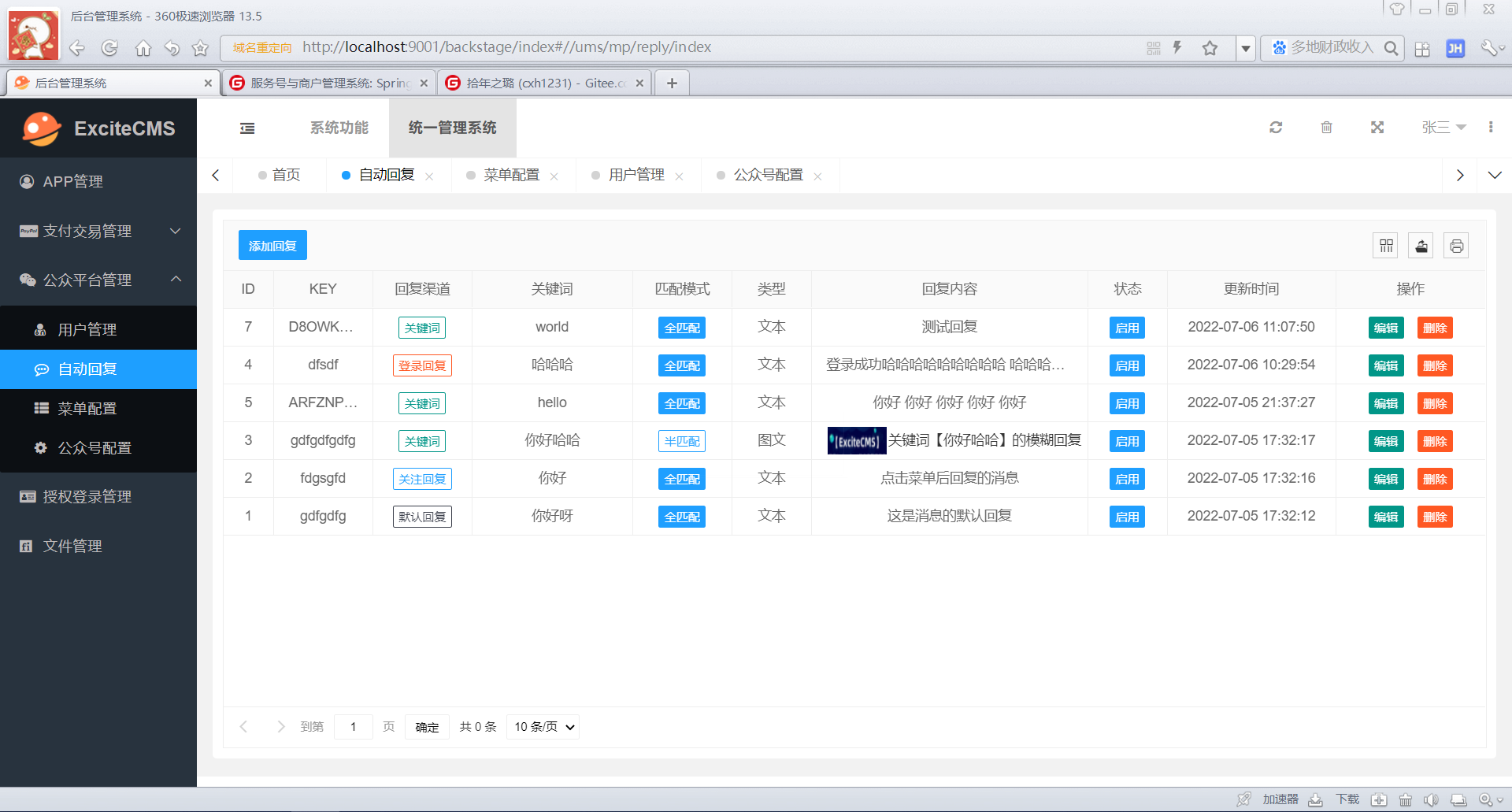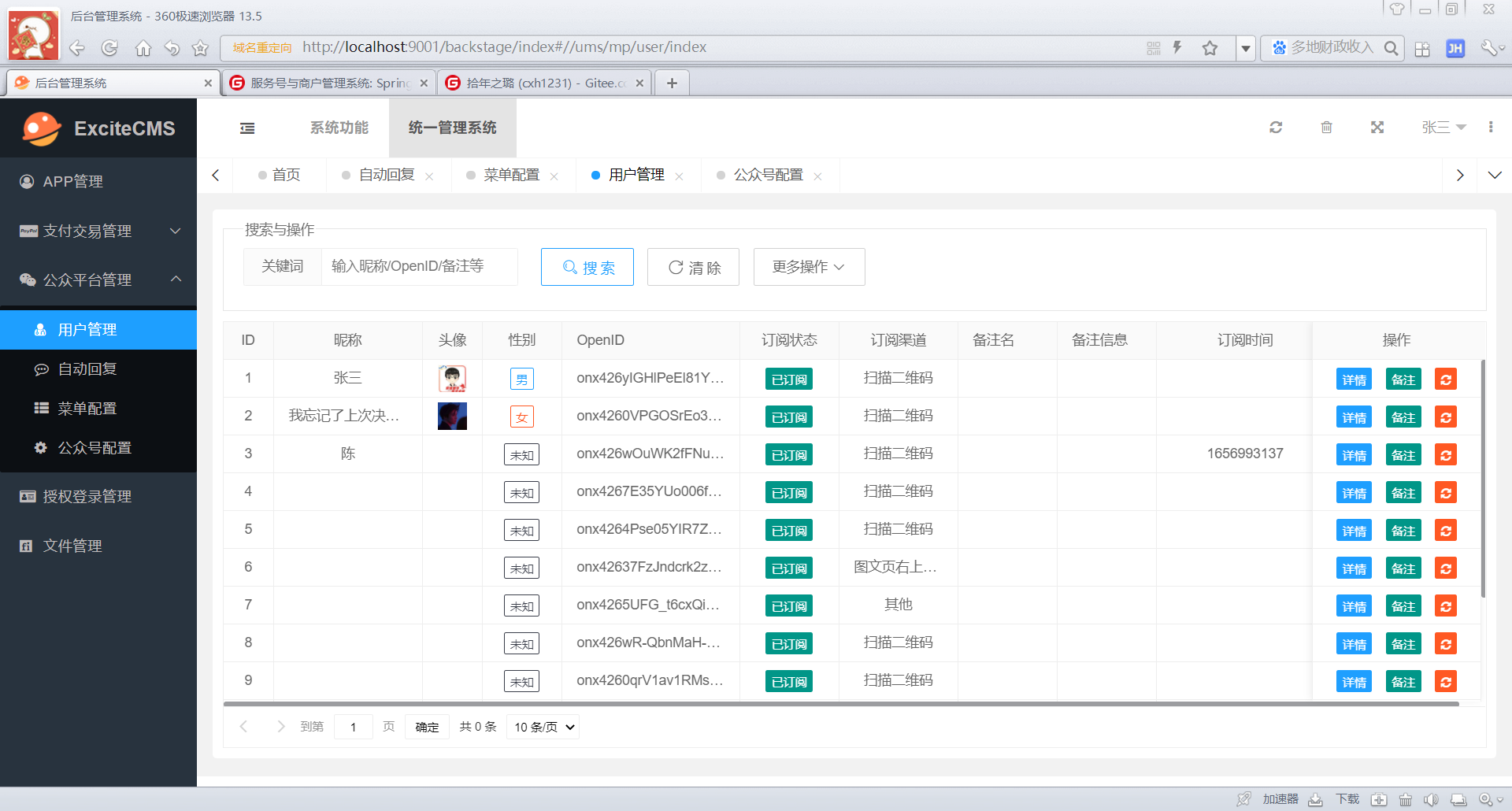 - 公众号管理:集成公众号配置,公众号的菜单、自动回复、消息管理,以及实现通过带参数的二维码关注公众号登录和关注后回复验证码登录两种第四方登录功能;