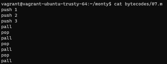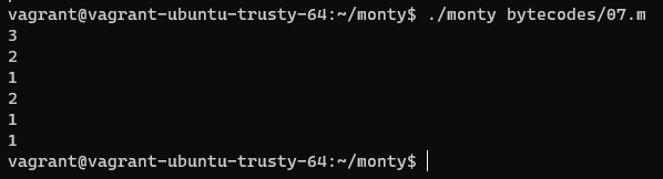 Monty 0.98 is a scripting language that is first compiled into Monty byte codes (Just like Python). It relies on a unique stack, with specific instructions to manipulate it. The goal of this project is to create an interpreter for Monty ByteCodes files.