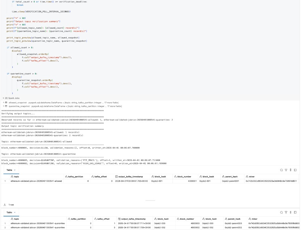 4000001->ethereum-validated-jobrun-20260401000541-allowedwithdecision=ALLOW4000002->ethereum-validated-jobrun-20260401000541-quarantinewithvalidation_reasons=["HIGH_GAS_USAGE"]4000003->ethereum-validated-jobrun-20260401000541-quarantinewithvalidation_reasons=["PII_EMAIL"]Output verification screenshot: