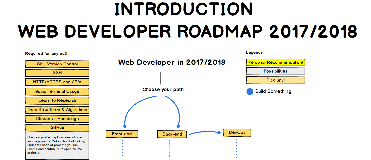 These charts were created by originally by GitHub user Kamranahmedse. They visualize three roadmaps to becoming a web developer.