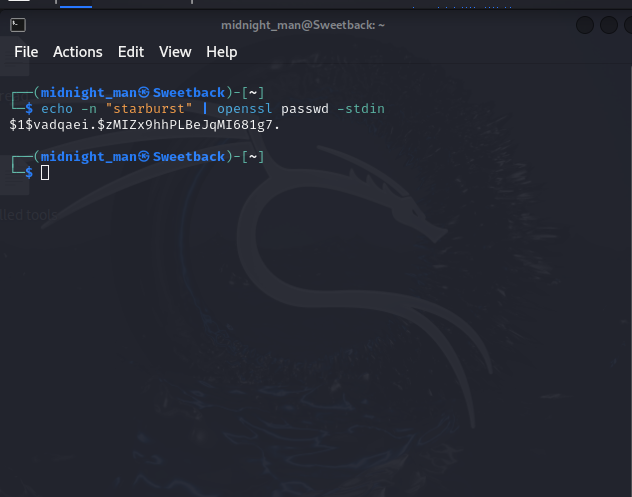 Create a MD5-crypt hash of a weak password (starburst).: