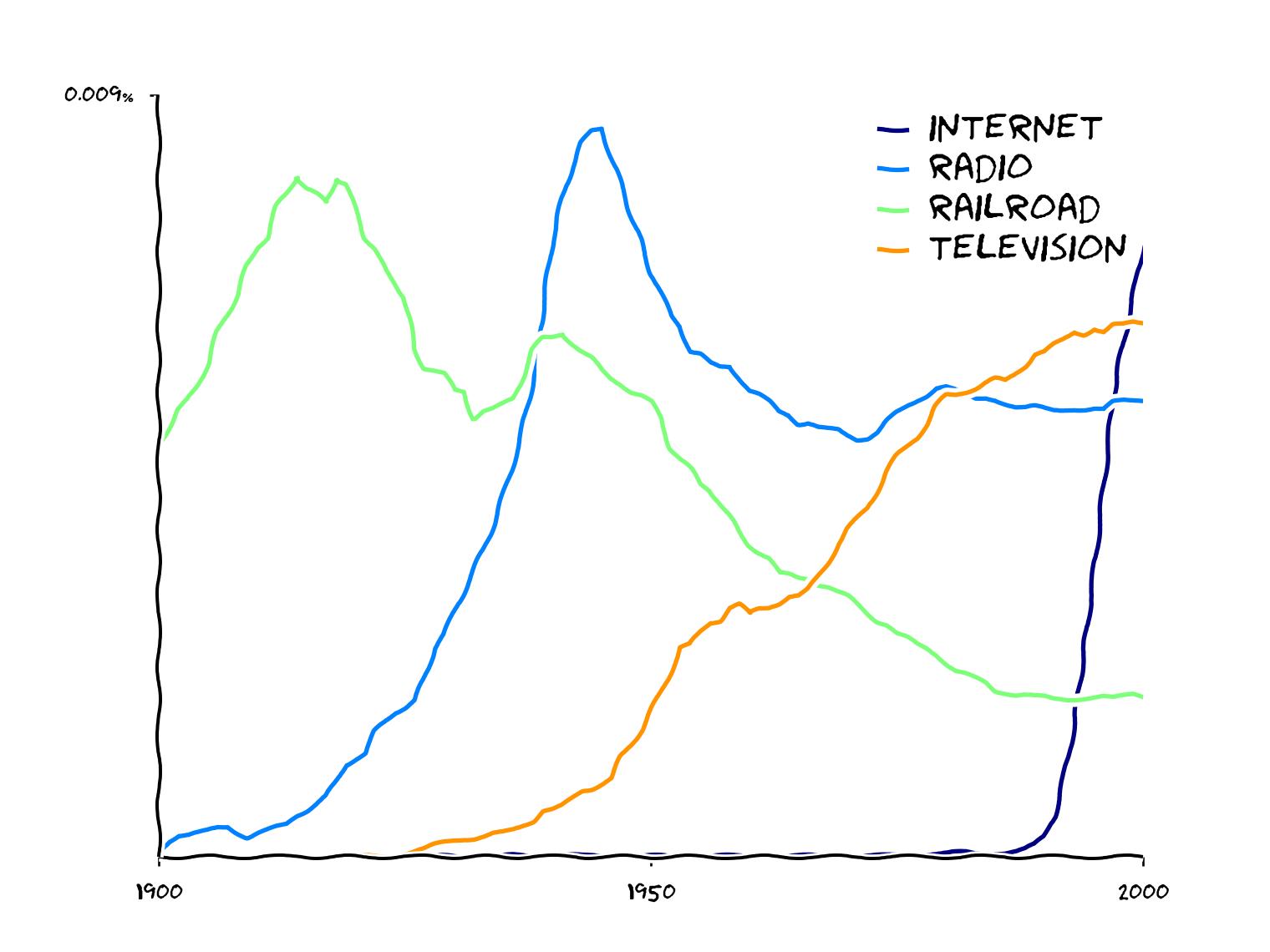 python getngrams.py railroad,radio,television,internet -startYear=1900 -endYear=2000 -caseInsensitiveThe first way to create a plot is to use the supplied xkcd.py script to generate awesome XKCD style charts. However, there are two ways to use the script: