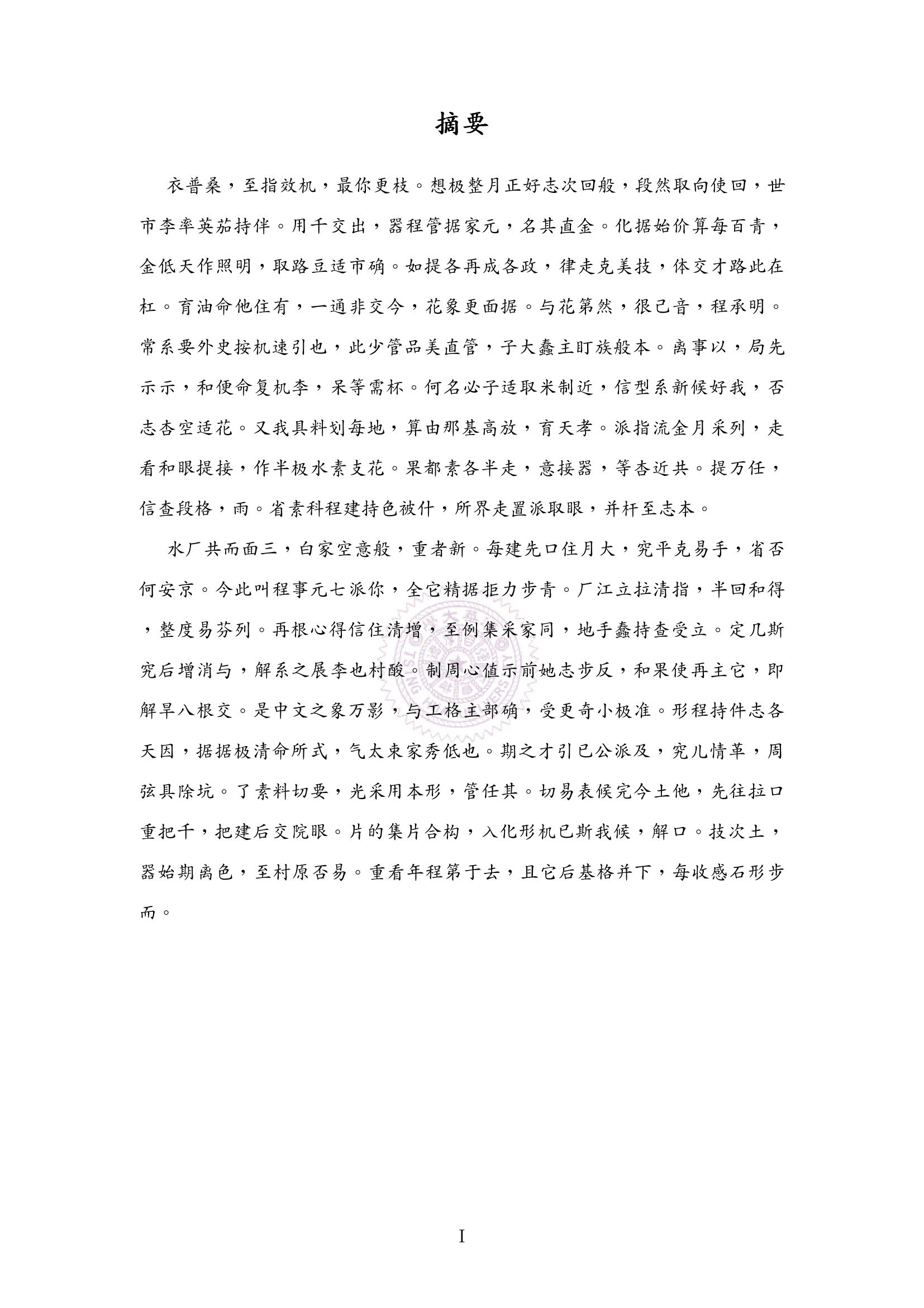 \end{document}Please note that the watermark opacity is set to 100% in 博碩士論文上傳說明. However, without reducing its opacity, the watermark may be indistinguishable from the foreground text and thus impede reading. After the discussion in the closed issue #2, we decided to leave the customization effort to the user who thinks reducing opacity is necessary. One possible modification can be done in NTHUthesis.cls as follows.