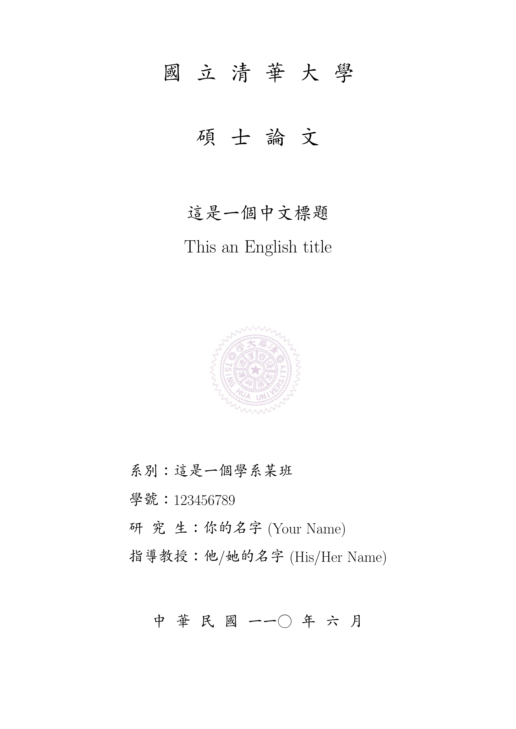 \documentclass[doctor,nowatermark]{NTHUthesis}NTHUthesis offers an additional mode for typesetting theses in Chinese by specifying the zhmode option. For example,