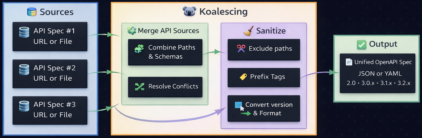 Koalesce is an open-source .NET library for merging and sanitizing OpenAPI specifications.