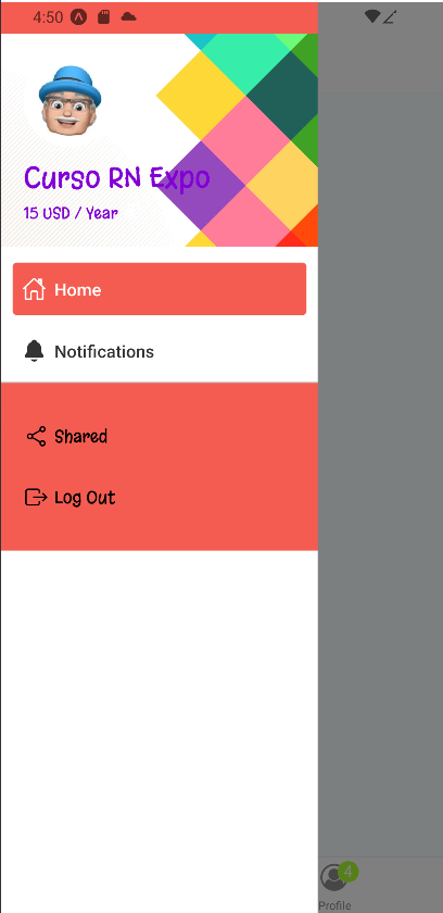 Uso de React Native, Navegacion por Stack, Tab, Drawer, CustomDrawer, Fonts