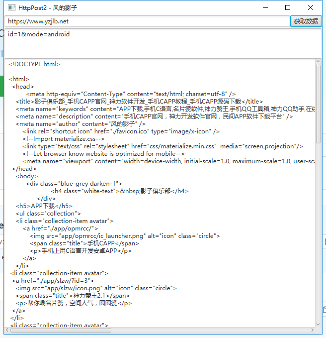 HttpPost2 这个post工具采用JavaFx框架编写,用于开发调试 普通get提交 在第一个输入框中输入url即为普通的get请求 普通post提交 在第二个输入框中输入post数据,则以post方式提交,若留空为get方式 增强版post提交 第一个输入框留空,在post内容里直接输入以下格式的文本,然后点击获取数据按钮,这种方式主要用于配合开发时的log输出实现快速调试,如果要用get方式提交同理 返回json数据自动格式化 为了调试数据方便,返回的数据自动格式化,去除了一个json格式化的按钮