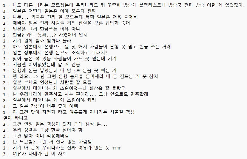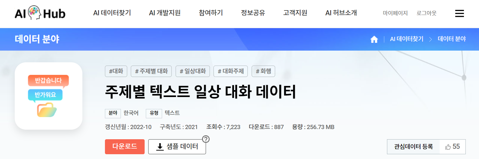 AI hub에서 제공하는 '주제별 텍스트 일상 대화 데이터'를 사용했습니다. 제공받은 말뭉치 안에는 2,3명의 사람이 주고받은 대화 내용이 들어있습니다.