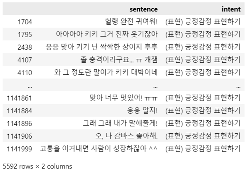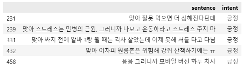 df.loc[(df['sentence'].str.contains('응') & df['sentence'].str.contains('맞아')), 'intent'] = '긍정'