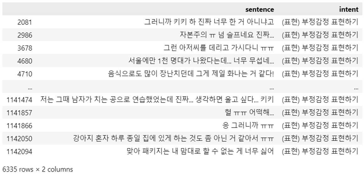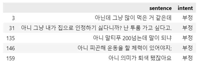 df.loc[(df['sentence'].str.contains('아니') & df['sentence'].str.contains('싫어')), 'intent'] = '부정'