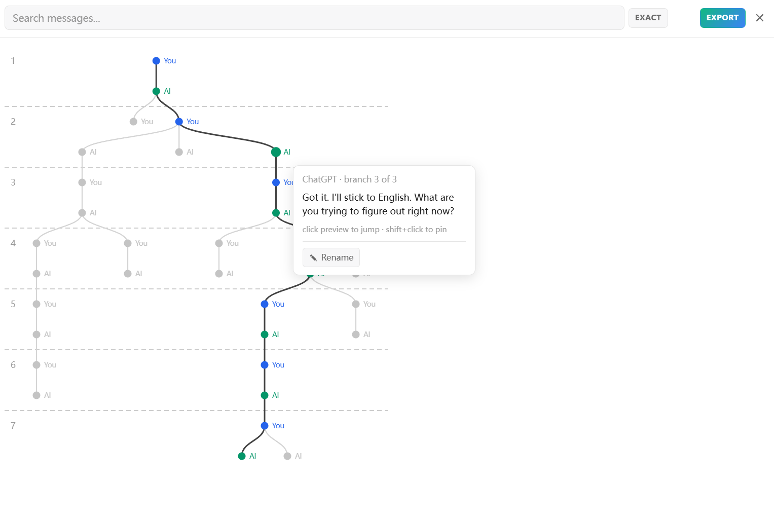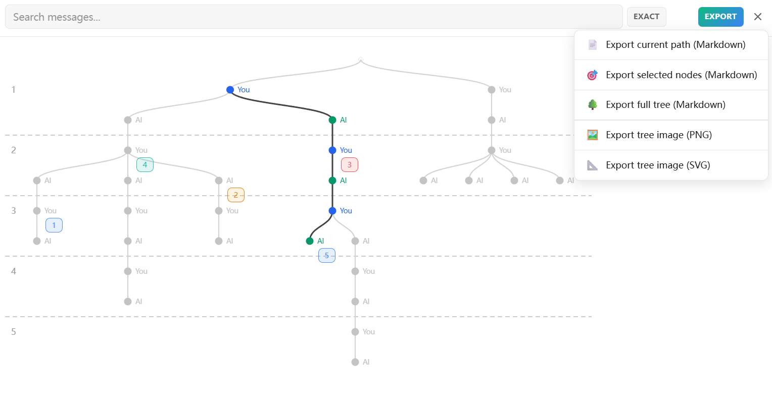 ChatTree reveals the full conversation tree as an interactive diagram, so you can see all branches, jump to any message, and never lose your work.