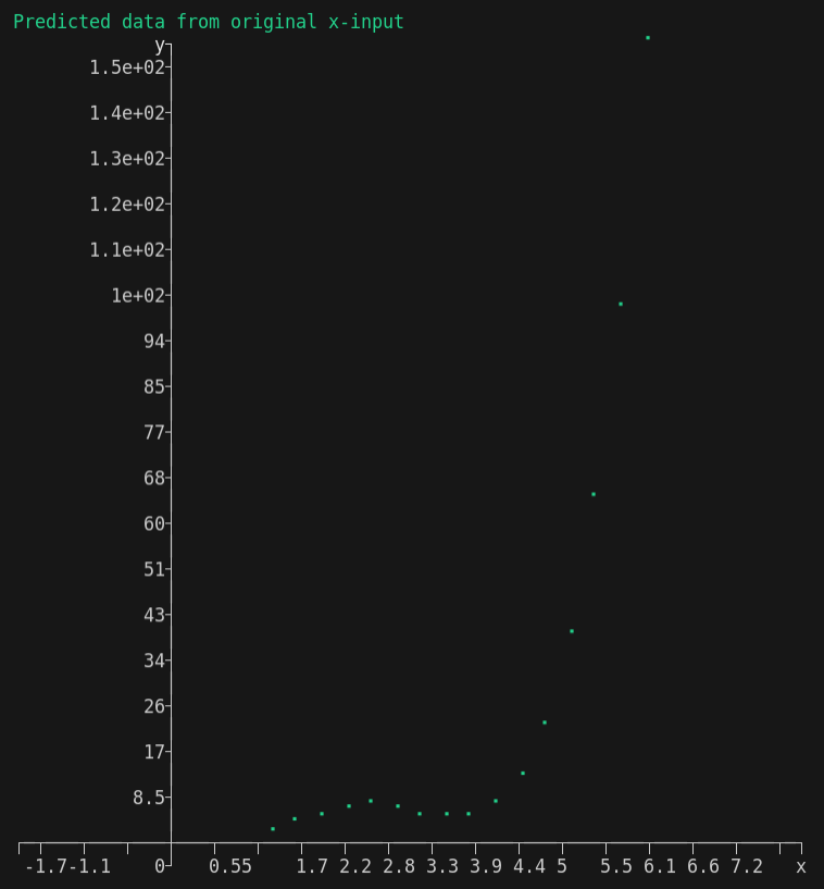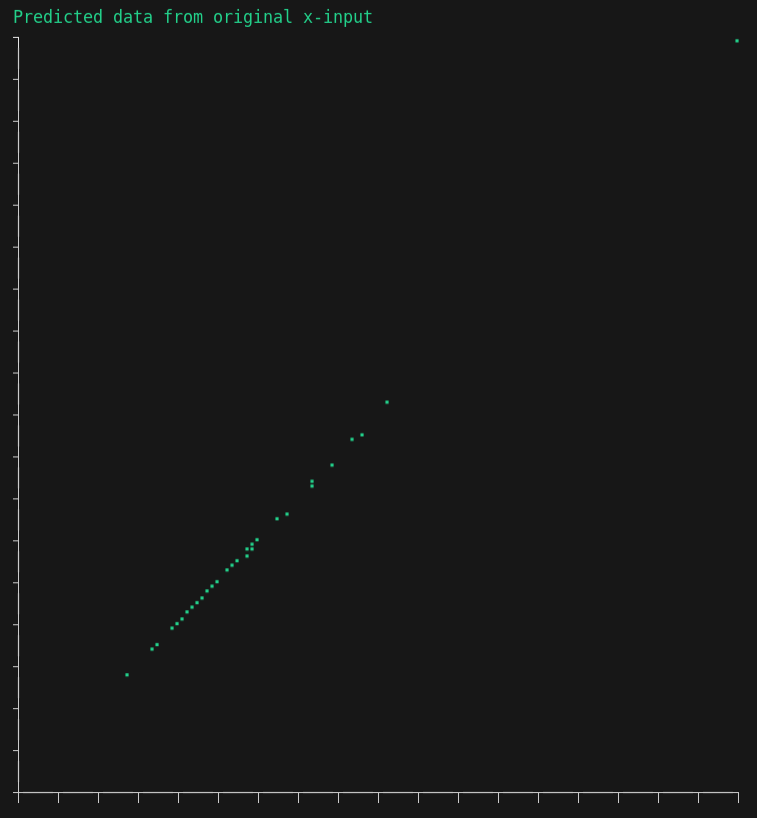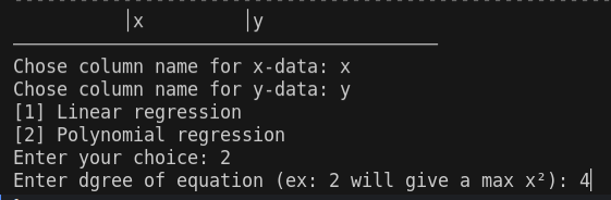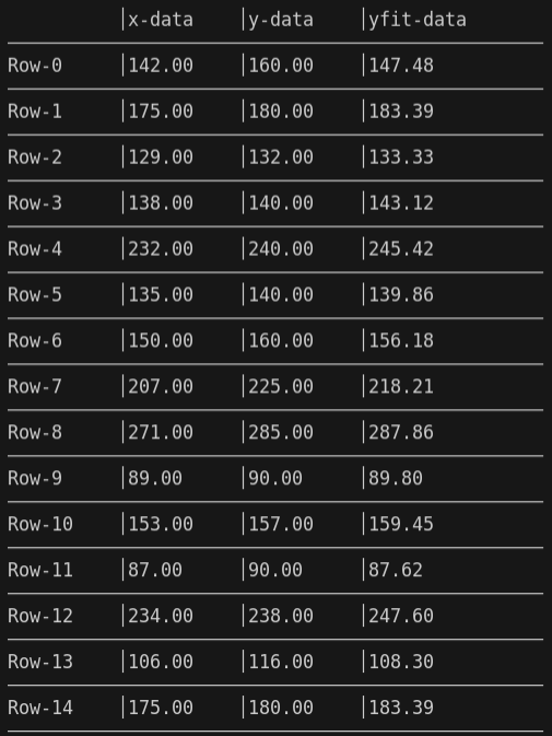 - Shows a table containing x-values, y-values and the predicted data