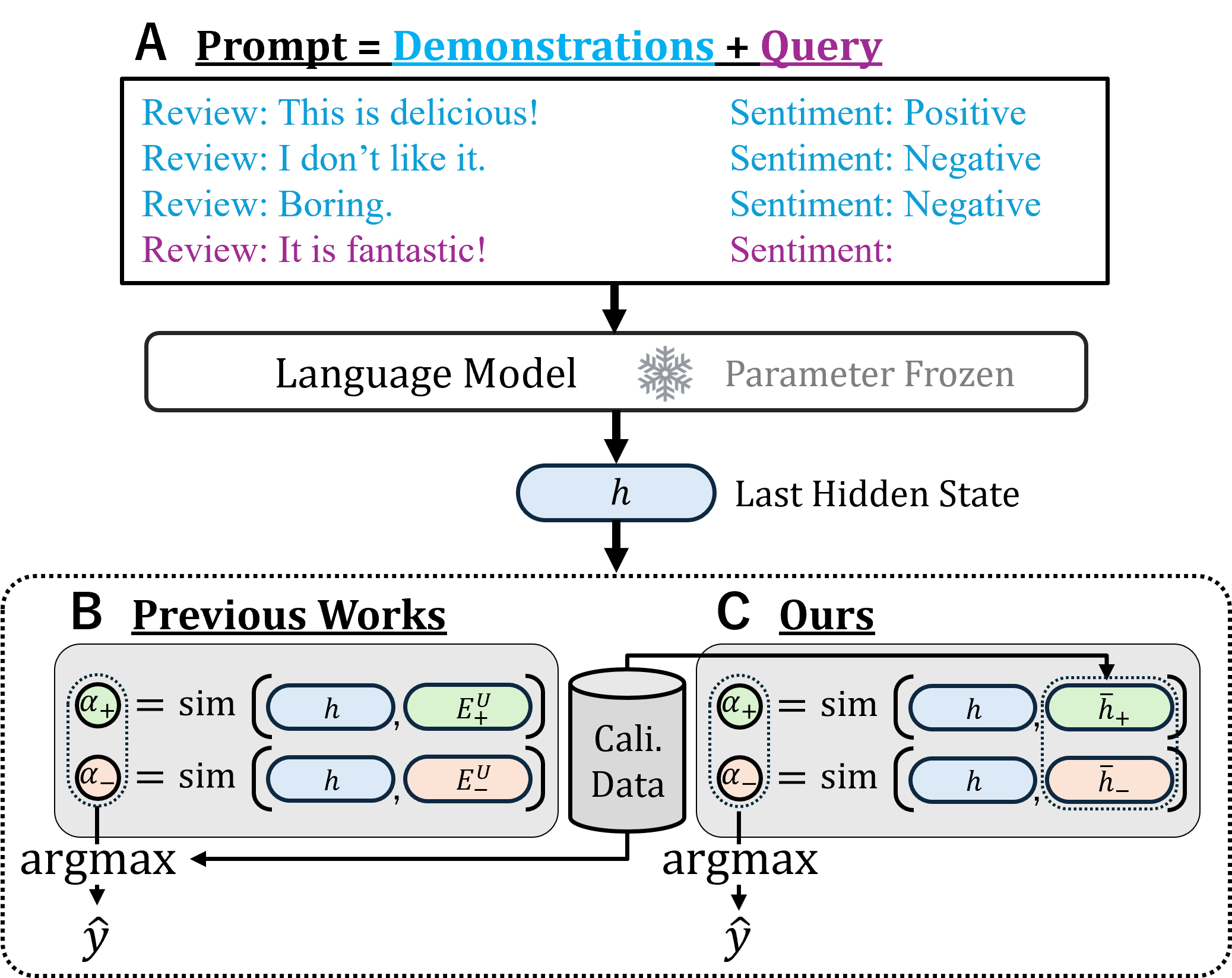 In-Context Learning (ICL) typically utilizes classification criteria from output probabilities of manually selected label tokens. However, we argue that such token-based classification criteria lead to suboptimal decision boundaries, despite delicate calibrations through translation and constrained rotation applied. To address this problem, we propose Hidden Calibration, which renounces token probabilities and uses the nearest centroid classifier on the LM's last hidden states. In detail, we assign the label of the nearest centroid previously estimated from a calibration set to the test sample as the predicted label. Our experiments on 6 models and 10 classification datasets indicate that Hidden Calibration consistently outperforms current token-based baselines by about 20%~50%, achieving a strong state-of-the-art in ICL. Our further analysis demonstrates that Hidden Calibration finds better classification criteria with less inter-class overlap, and LMs provide linearly separable intra-class clusters with the help of demonstrations, which supports Hidden Calibration and gives new insights into the principle of ICL.