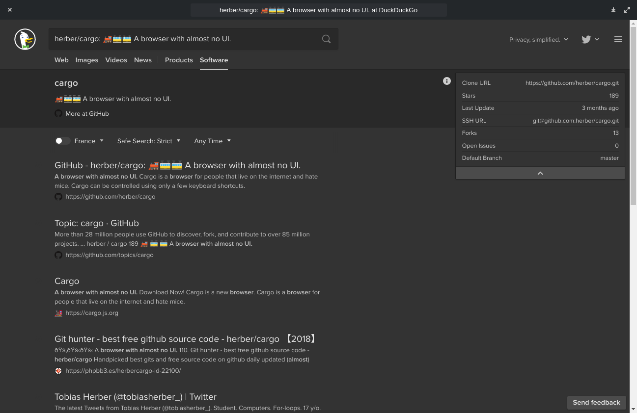 Cargo is a browser for people that live on the internet and hate mice. Cargo can be controlled using only a few keyboard shortcuts. Cargo only includes the most useful features of a browser, this way unnecessary features can't disturb you while surfing the interwebz. I built cargo, because I did not use most features that my browsers of choice(chrome and firefox) had.