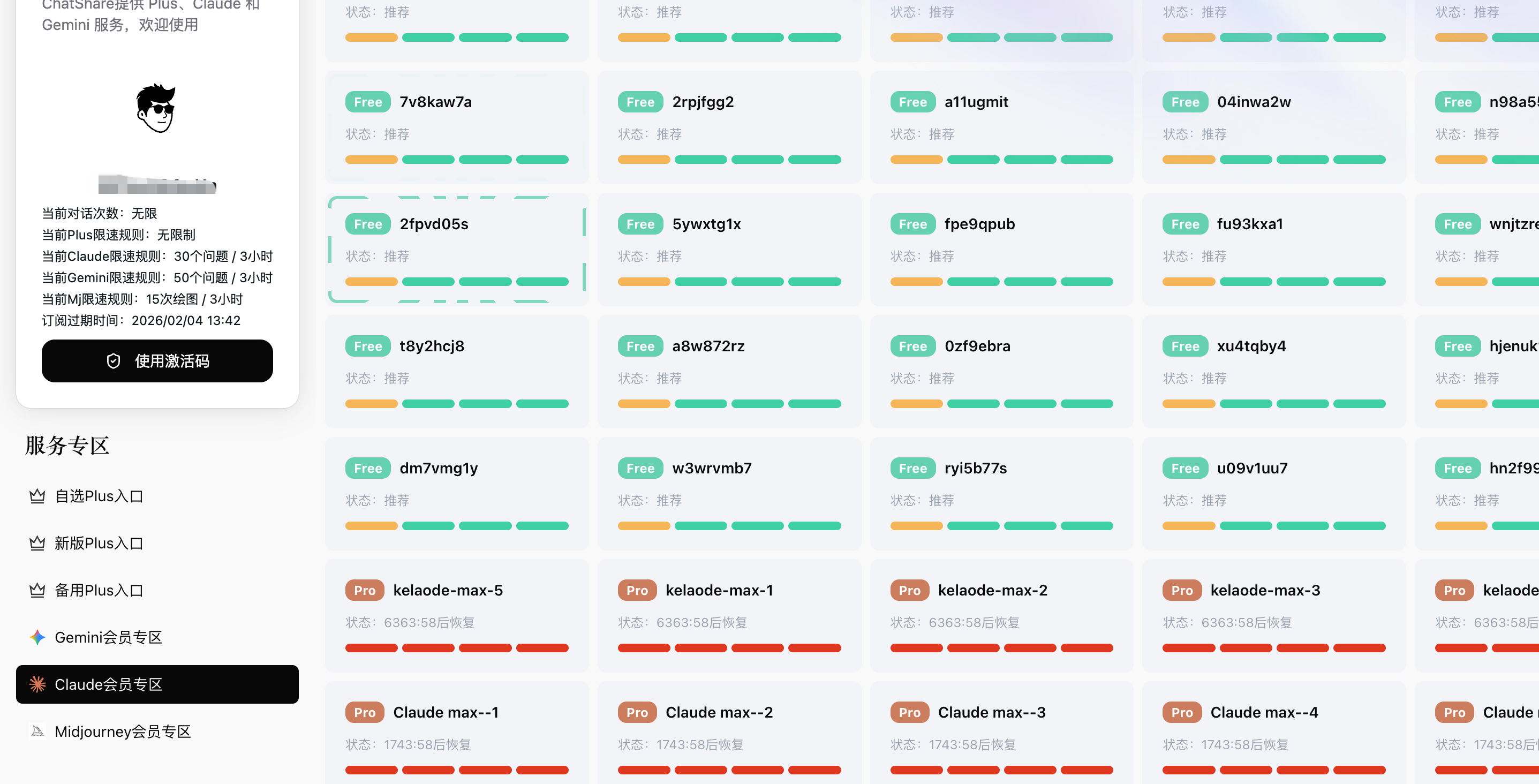 但是注意,这里的 claude 镜像还是因为官网封号厉害的问题,大多数是免费版的账号,Pro 和 Max 的账号有时候需要等,介意的话,建议还是去充值个人 Claude Pro