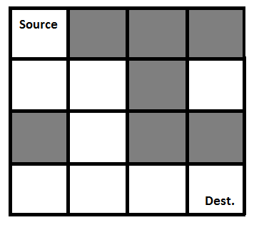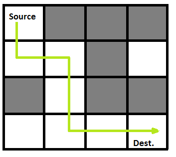 Approach: Form a recursive function, which will follow a path and check if the path reaches the destination or not. If the path does not reach the destination then backtrack and try other paths.