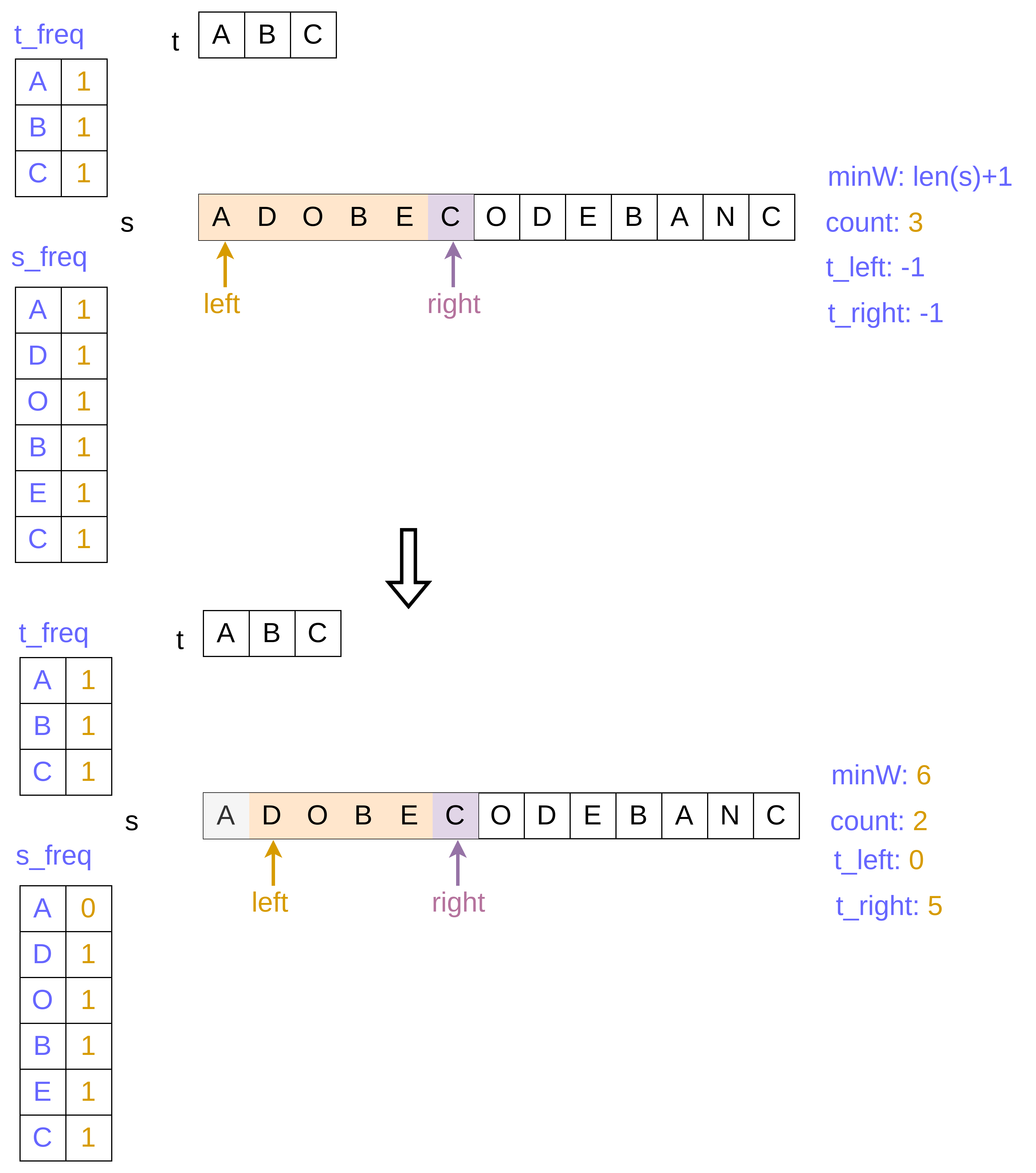 - 初始化 s_freq , t_freq 兩個 HashTable 用來各自紀錄 s, t 的字元次數出現狀況, count= 0 用來紀錄 s match 到 t 的字元個數, left = 0, right = -1, sub_left = -1, sub_right = -1, minW = len(s)+1