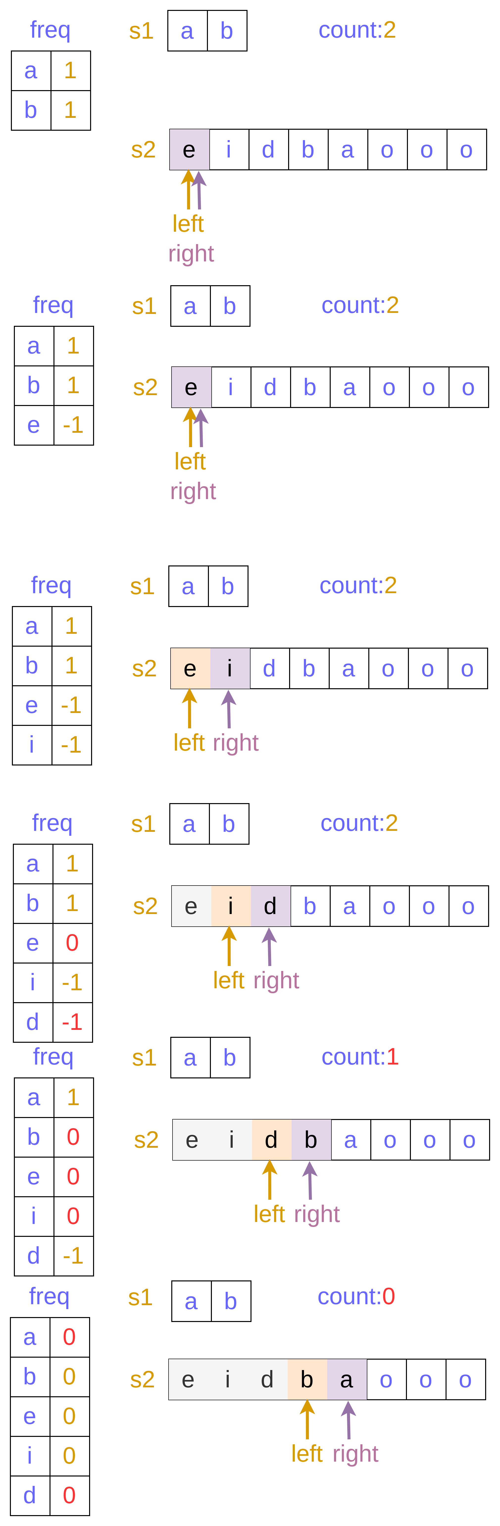 - 更新 freq[s[left]] = freq[s[left]] + 1, left = left + 1