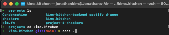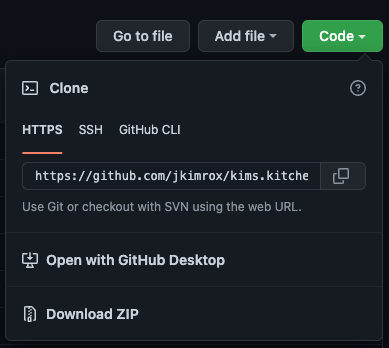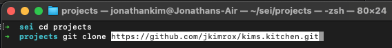 Next, open your terminal application and land in your desired directory in which you hope to install this application in. Then enter "git clone (link copied from GitHub)" to install Kim's Kitchen.