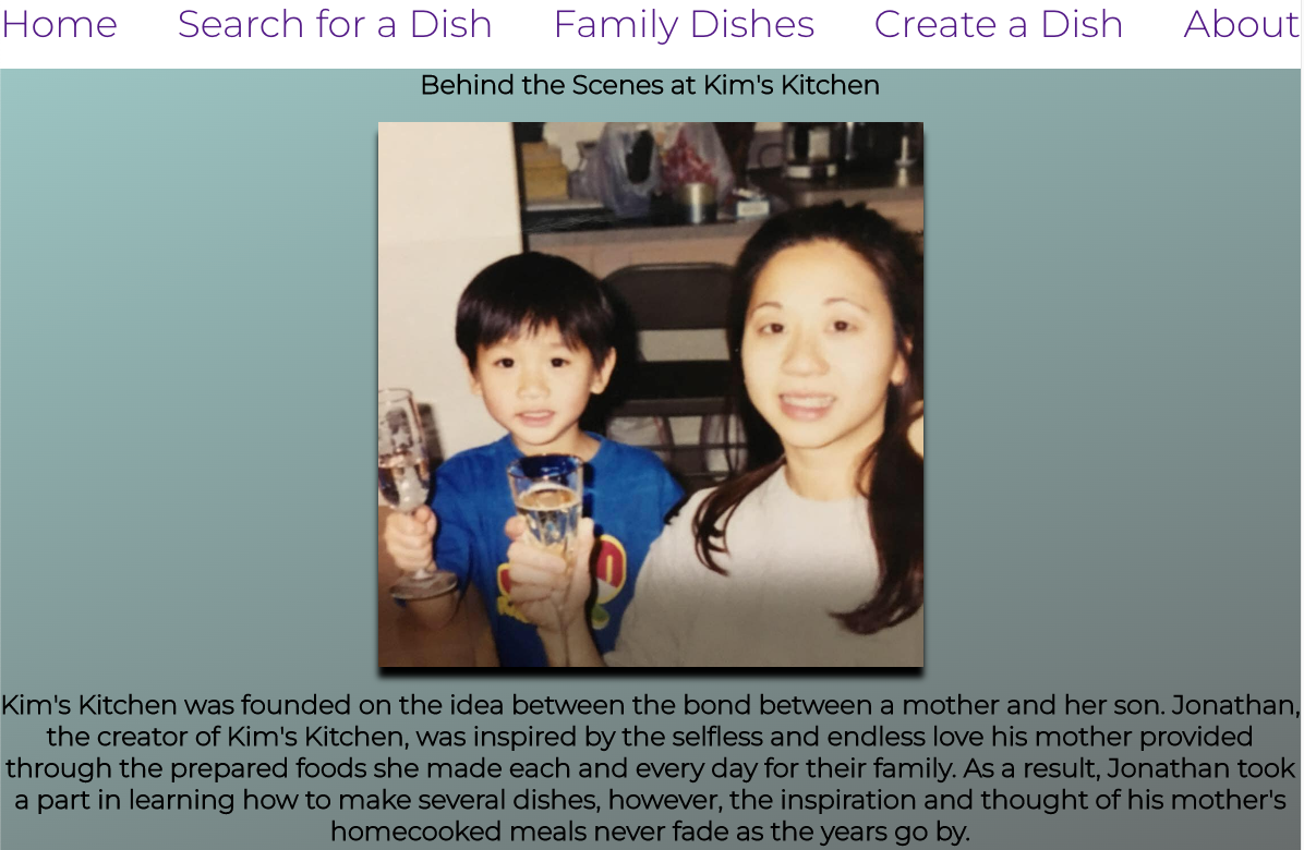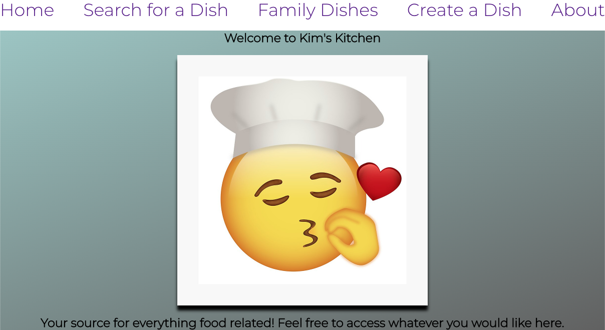 Kim's Kitchen is a full MERN stack application that utilizes a front end of React and a backend of MongoDB hosted by Heroku. The application allows users to search for possible dishes that they might possibly make and also permits them to add their own dishes to the site as well. Users might be inclined to spend hours on this application as the possibilities are truly endless with the amount of dishes that are available to view and even create on their own.
