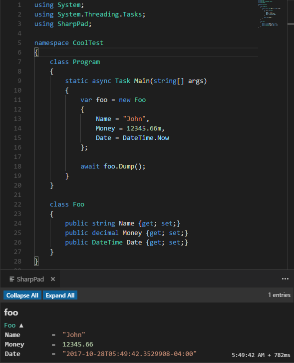 Install the extension via the VSCode marketplace, then install the SharpPad package into your project via NuGet. Throw in a using SharpPad; at the start of your class, and Dump() away!