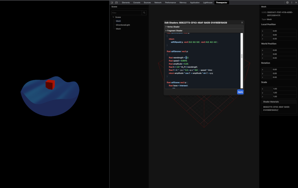 When working on shaders it is sometimes quite cumbersome to reload the scene on every tiny change. With threespector you can edit your GLSL code and update the shaders directly without reloading the scene. This should be especially helpful when experimenting: