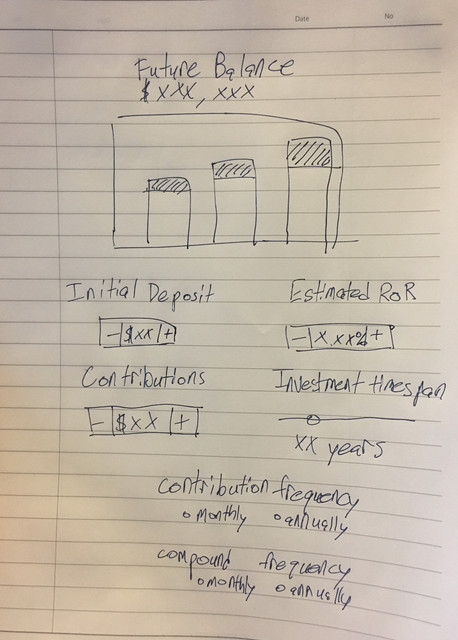 This was the initial wireframe that I drew up. I decided to add a daily option for contribution and compound frequency to the final version as well as consolidating the options into 2 columns.