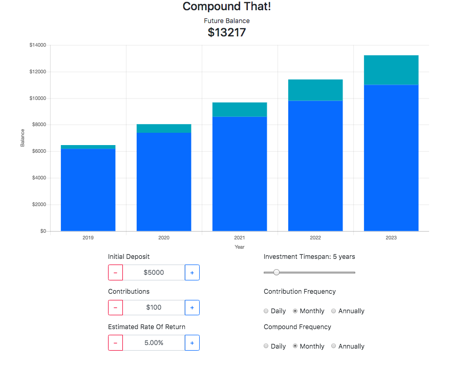 My mother recently became very interested in financial markets and we’ve had some very passionate discussions regarding trade wars, undervalued industries, and the health of the financial market as a whole. She’s constantly looking up historical rates of return for different financial assets so I thought it would be a fun project to build out a compounding interest calculator. I had a good idea of what I wanted the project to look like so I was able to present the basic wireframe to my mother, take in feedback, and execute the project.