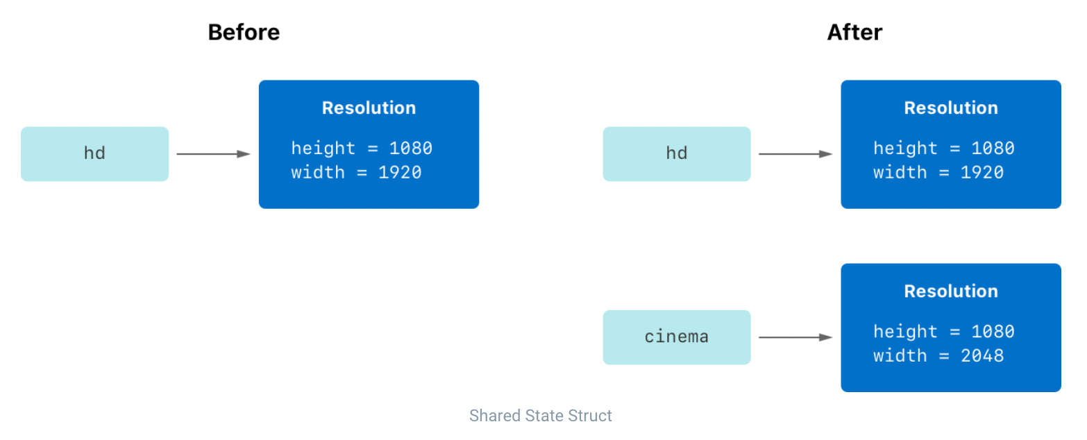 이때 구조체는 값 타입이므로 기존 인스턴스의 복사본이 생성되고 새로운 복사본이 cinema에 할당되게 됨
