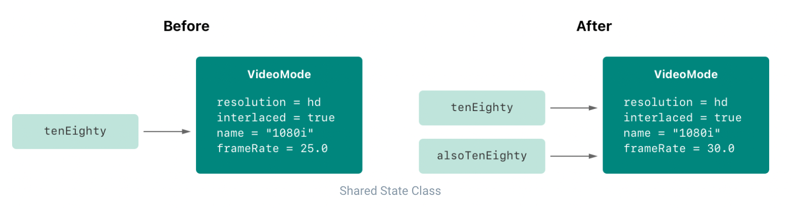 클래스는 참조타입이라서 alsoTenEighty 에 값을 할당할 때 실질적으로 같은 VideoMode 인스턴스를 참조하게 된다.
