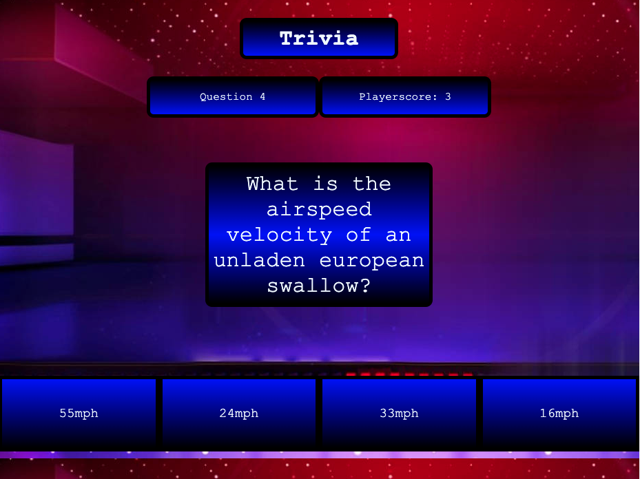 This is a simple, 1 player, multiple choice trivia game. Trivia, as we know it, came around in the 1960s when college students traded questions and answers about pop culture from their youth. In this game, you will be tested on random trivia questions from many categories. You may even need to possess knowledge fit for a king. How well can you do?