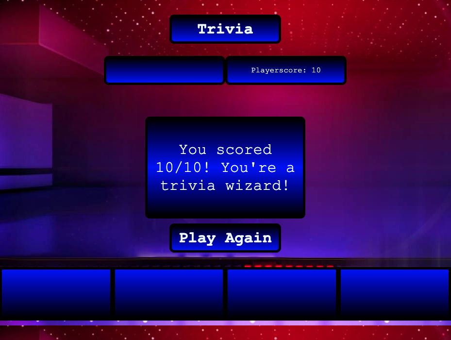 Just click the link below and you will be led to the game page. Click the 'Start Trivia' button and the game will begin. You will be asked 10 questions in total, each with 4 choices. Click whichever choice you think is best. You will shown whether you choice was correct or not, and the next question will load. Once you've answered all 10 questions, you will be shown your final score. You will also be given the option to play again if you so choose.