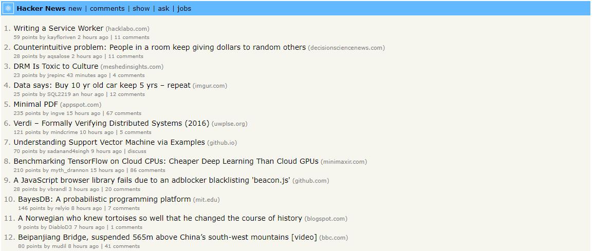 /stories/new/show/ask/jobs - Posts: Posts which were published at hackernews with post's score, author and date calculated with