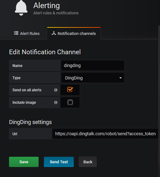 点击 alerting —> notifications,添加通知媒介,这里我们选择钉钉来进行集成。