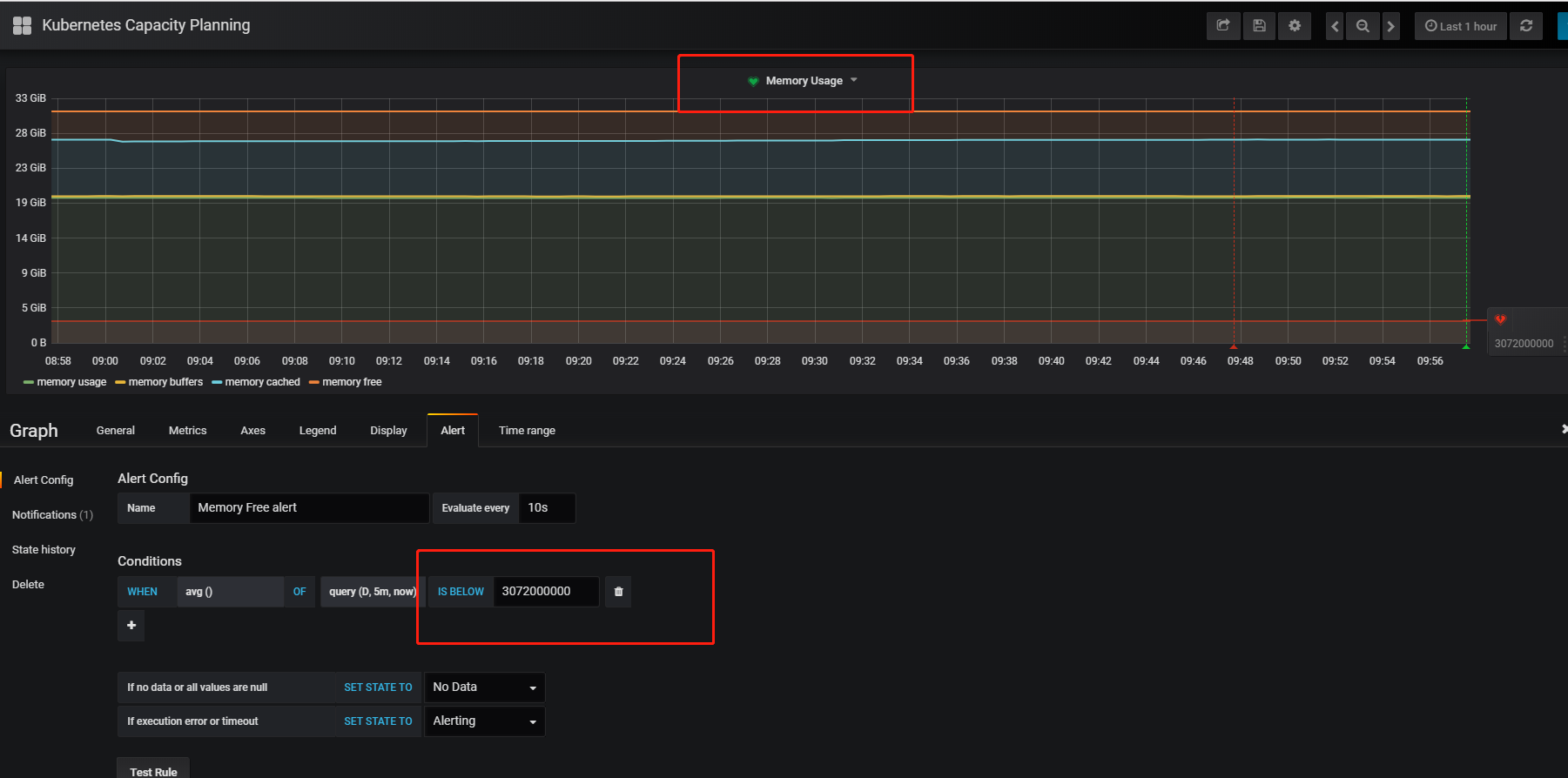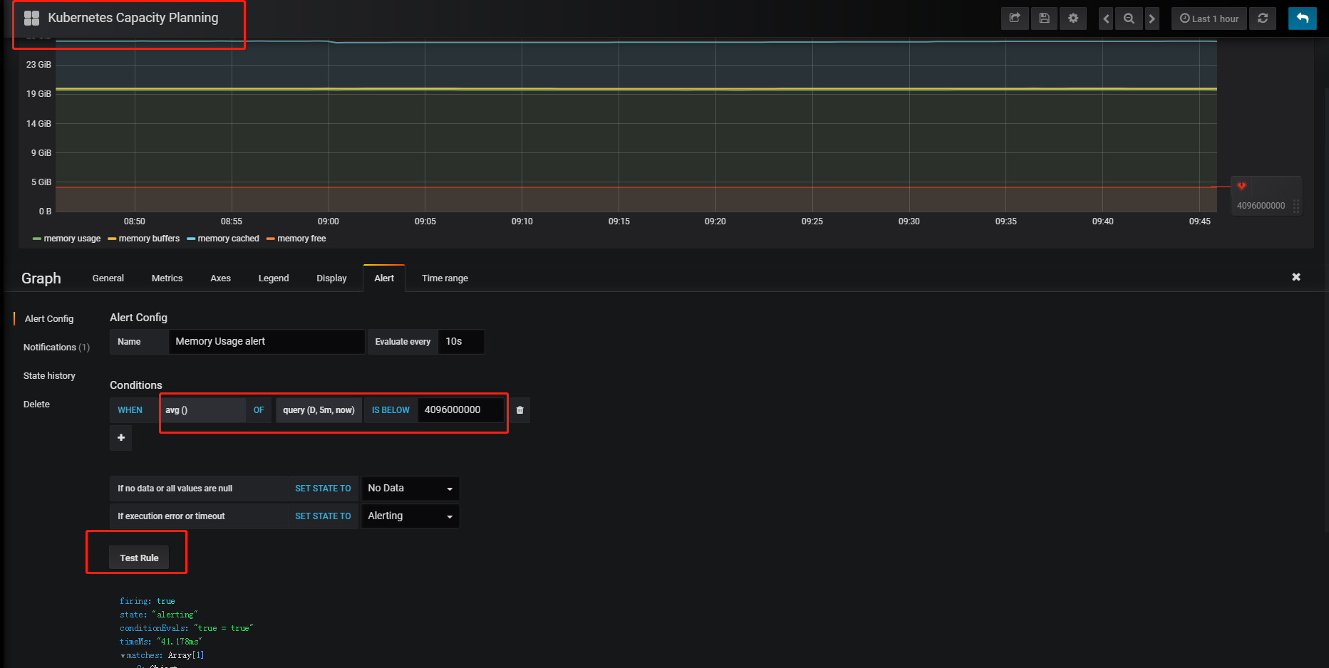 http://localhost:3000//d/tZeDCUKiz/kubernetes-capacity-planning?fullscreen=true&edit=true&tab=alert&panelId=4&orgId=1,之所以是localhost,就是我们没有配置Grafana的server信息。后续