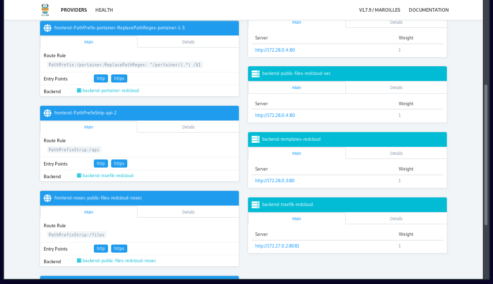 redcloud_filesvolume. You can also access theredcloud_logcontainer content, protected by the same.htpasswdas Traefik. Default credentials:admin:Redcloud - https://your-server-ip/api: Traefik reverse-proxy health monitoring page. Shows live stats about routes, backends, return codes. Will also show reverse-callback implant data if configured through Traefik.
