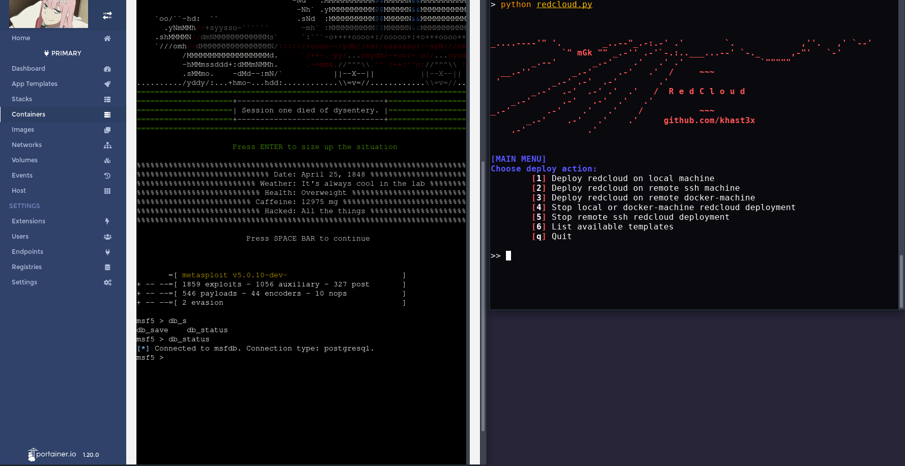 The following demo showcases deployment of Redcloud through ssh, followed by Metasploit. We then look at Traefik and a live volume attached to Metasploit. Finally, we check that Metasploit's DB is functional with the web terminal, delete the container, and terminate Redcloud.