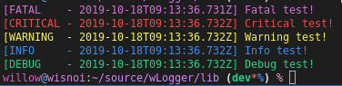 Logger.fatal('test'); // Outputs a fatal error string with green text.Every instance of SimpleLoggerW comes with an object containing a list of foreground colors, background colors, and text attributes.