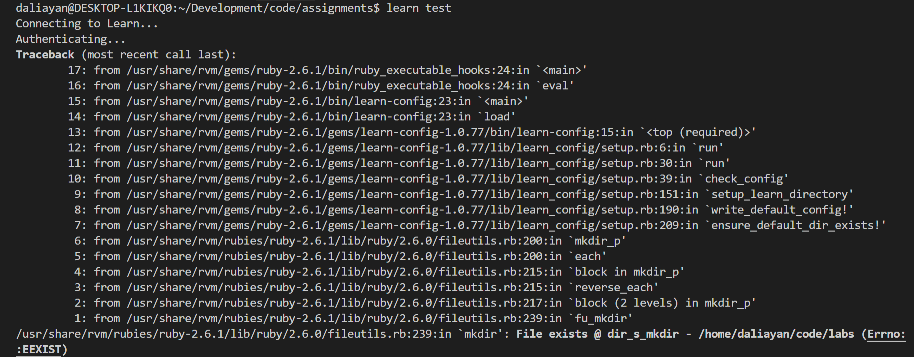 I've been trying with other students in my cohort to figure out why I don't get the same results they do when they use "learn test" to check their work. In every single lab I've worked on so far, I receive the same outcome after typing "learn test". I don't want to continue submitting my assignments using Github for the rest of the cohort, and I also don't want to fall behind. help please.