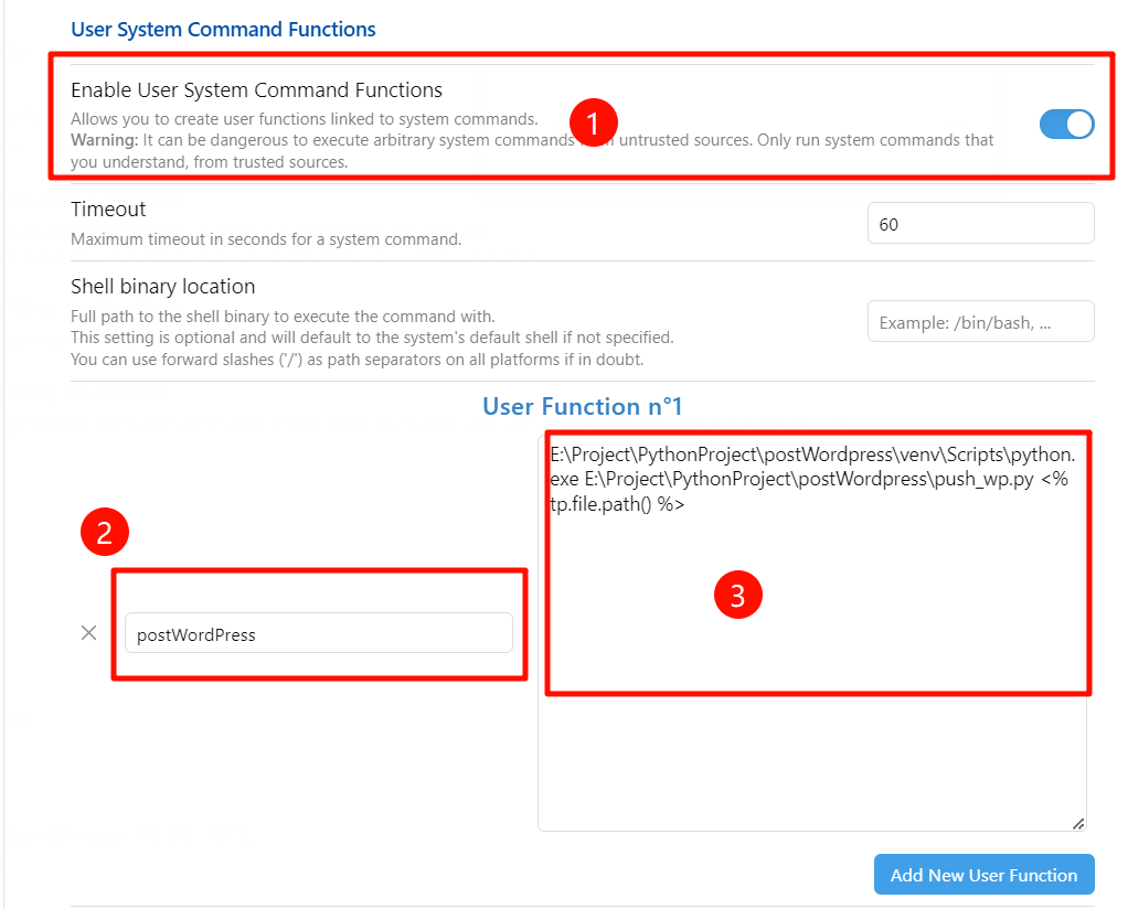 <your python path> <path of push_wp.py> "<% tp.file.path() %>"