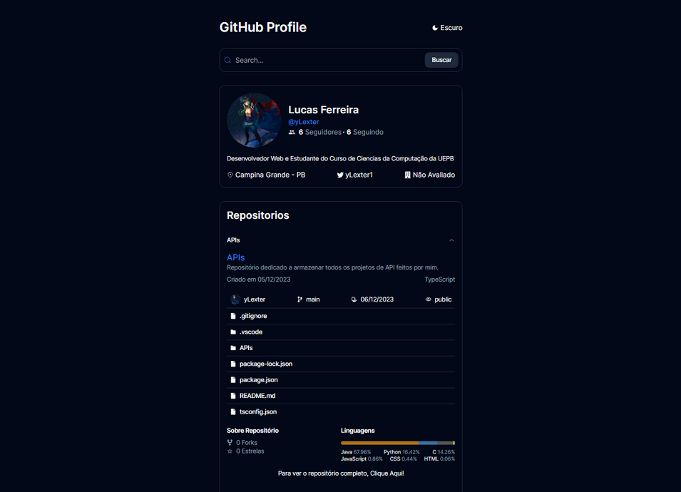 The GitHub Profile project is a web application developed with Next.js that allows you to retrieve user data from GitHub in a simplified way. With this application, you can get basic information about a GitHub user such as name, profile photo, number of followers, and public repositories.