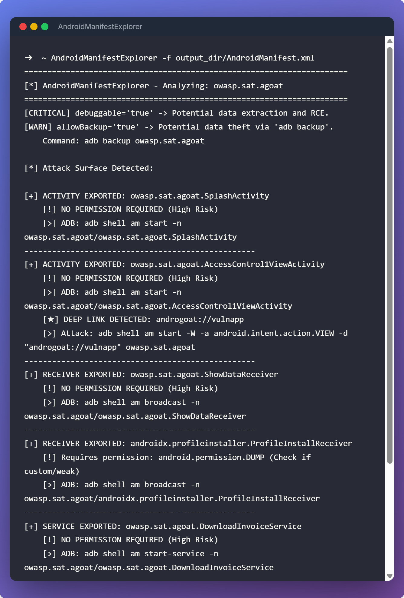 $: python3 AndroidManifestExplorer.py -f output_dir/AndroidManifest.xmlThe tool categorizes findings by risk and generates specific adb commands: