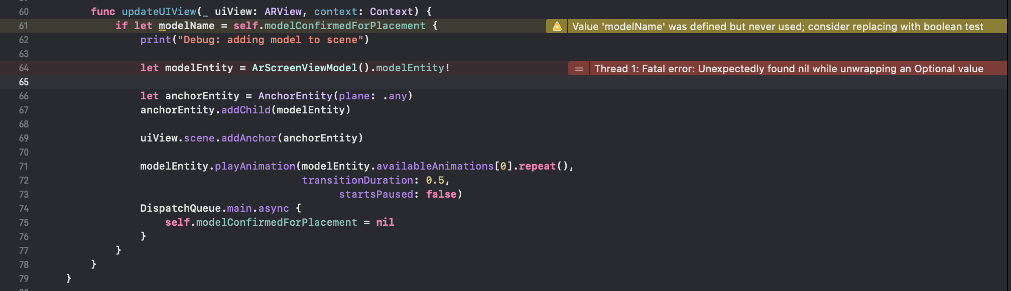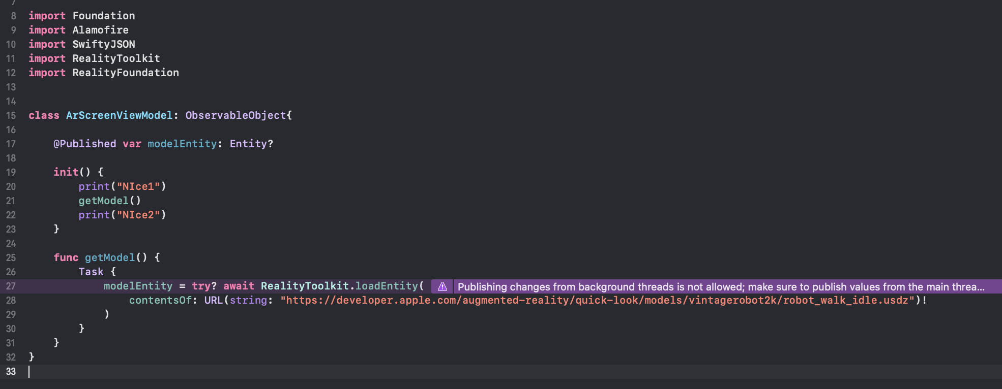 I wrote a ViewModel where I load the model in init() <img width="985" alt="image" src="https://user-images.githubusercontent.com/94132712/222350975-8b01e761-4ee2-4404-be95-3c0a13784ca7.png"> <img width="1007" alt="image" src="https://user-images.githubusercontent.com/94132712/222351435-5dea6a68-47bb-4f13-8d26-43b804256cb4.png"> Can you please tell me what I'm doing wrong