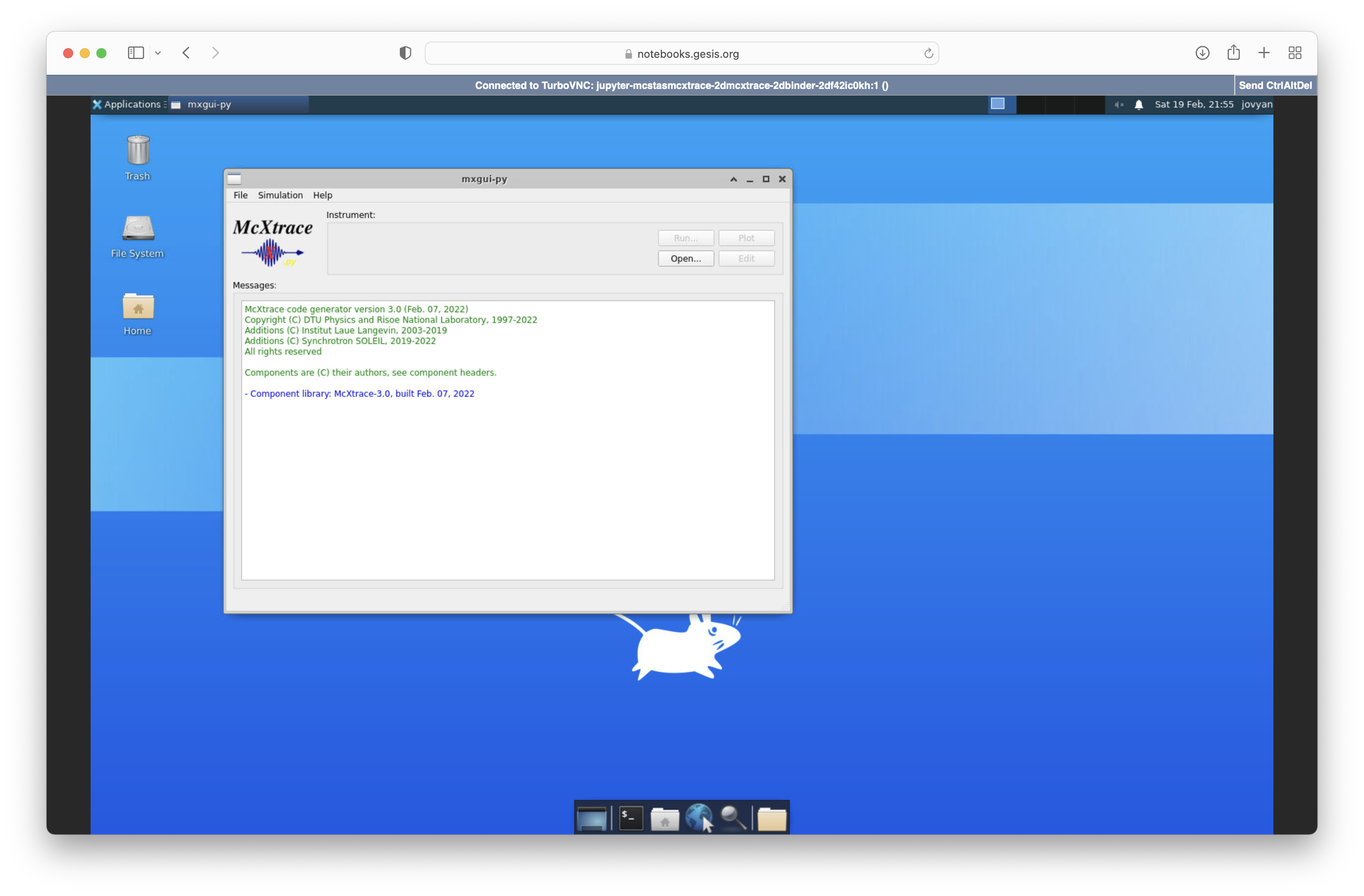 A full desktop, running at Binder for free, will appear in your browser after e.g. a few minutes (be patient). The McXtrace software is available from the Applications menu in group Education.
